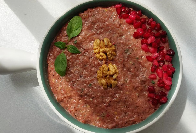 این مرحله به طور دلخواه انجام می گردد، می توانید به میزان بیشتر یا کمتر از دستور دانه های ساییده شده انار را به محتویات اضافه کنید و آنها را مخلوط کنید و سپس نمک و فلفل را به مواد اضافه کنید و هم بزنید.